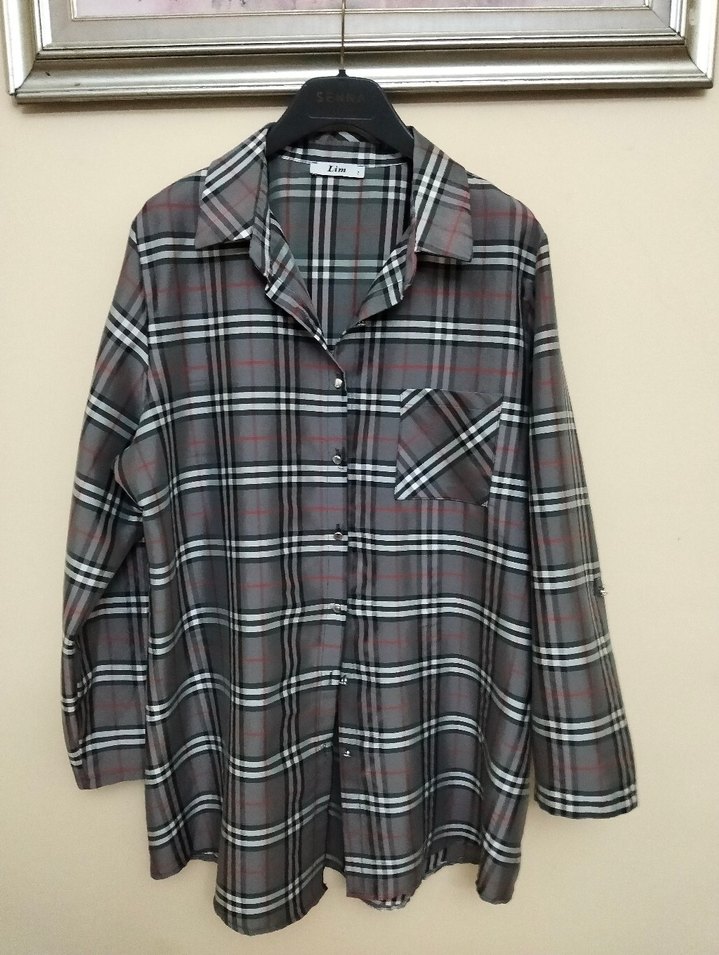 Düğmeli, uzun kollu, gri ekose desenli kadın gömlek. Rahat kesimli ve notalı yaka detaylı, yumuşak sentetik kumaştan üretilmiştir. Marka temsilidir
