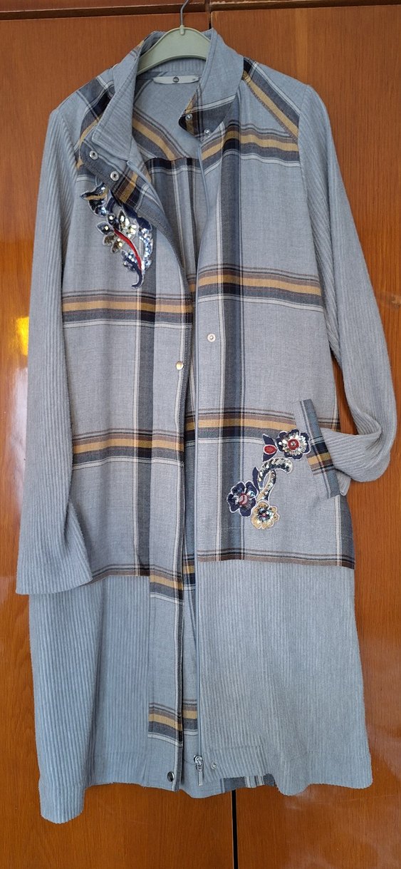 Düğmeli, uzun kesim gri tunik, yakasında ve üzerinde nakış detayları bulunur. Rahat kalıp ve bohem tarzıyla günlük kullanıma uygundur. biraz kullanılmıştır. ana Kumaşı çok iyi durumdadır. kollarında tüylenmeler mevcut