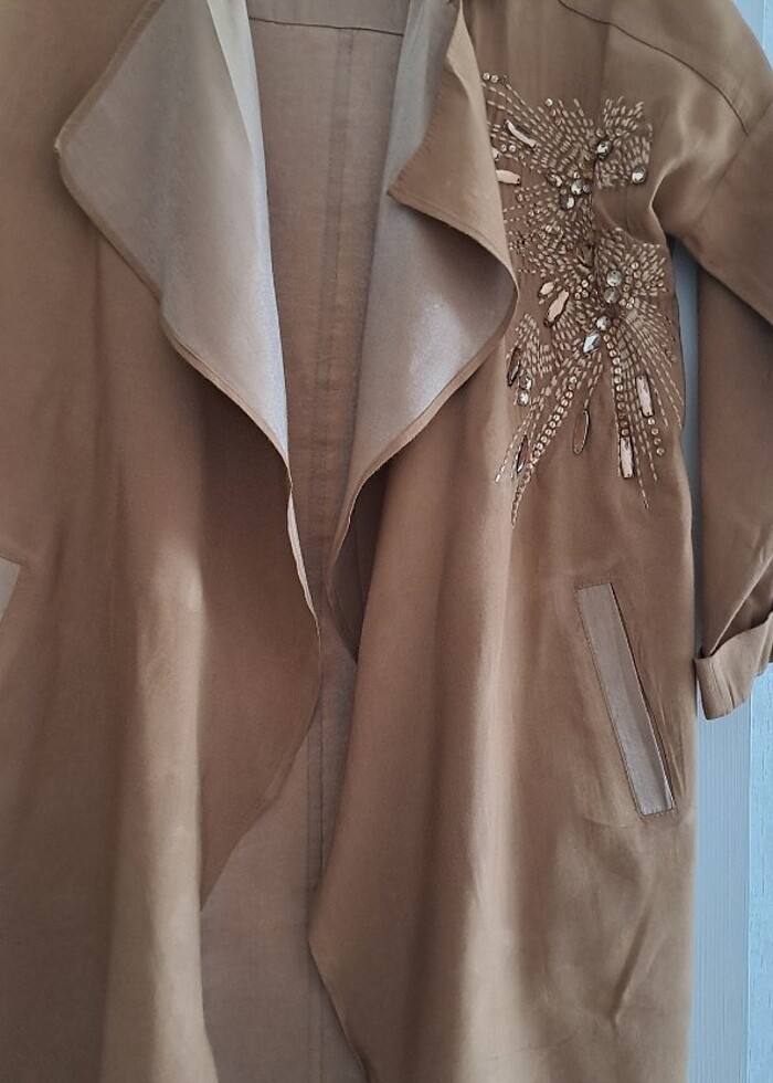 Yeni cok az 2 yada 3 giyildi çok güzel renk kumaş şal yaka cepleri olan yakası şahane taş işlemeli ister özel günlerde uster günlük çok kurtarıcı bir kap ceket tir 40 42 uyumlu 44 e de olabilir ölçü isteyiniz ekru içlik le giydim şahane oluyor içlik mevcut isteyen olurs ilan açarım