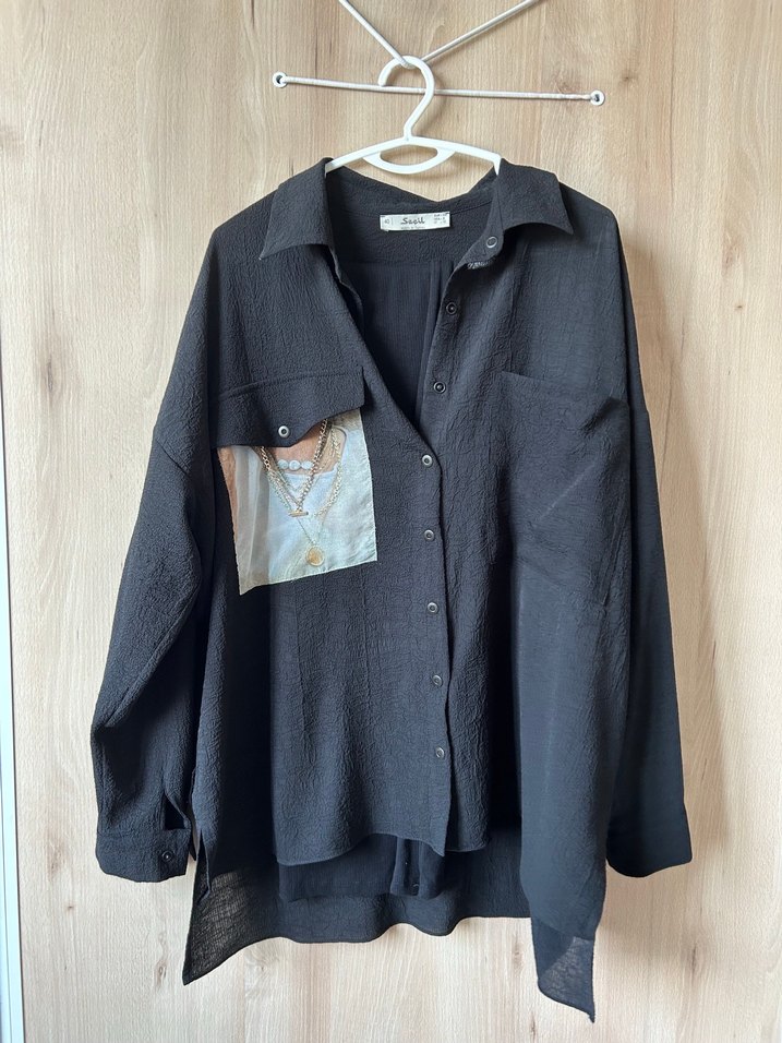 Düğmeli, uzun kollu siyah keten oversize gömlek. Yakalı ve baskılı güncel fiyatı 1800