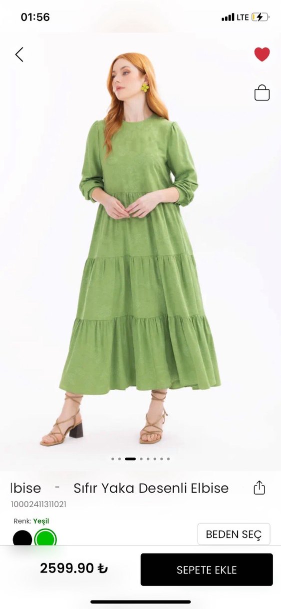 Ibise marka yeşil uzun elbise, sıfır yaka ve bol kesimdir. Yumuşak keten kumaştan, fırfırlı katmanlı tasarım bohem tarz sunar.