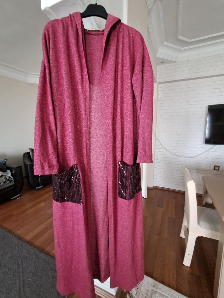 Kullanıma engel olan kusuru yoktur yırtığı söküğü vs Uzun, bol kesim sabahlık, uzun kollu ve parlak pembe kumaş ile payetli ceplere sahip, rahat ve bohem tarzda. 40 bedendir