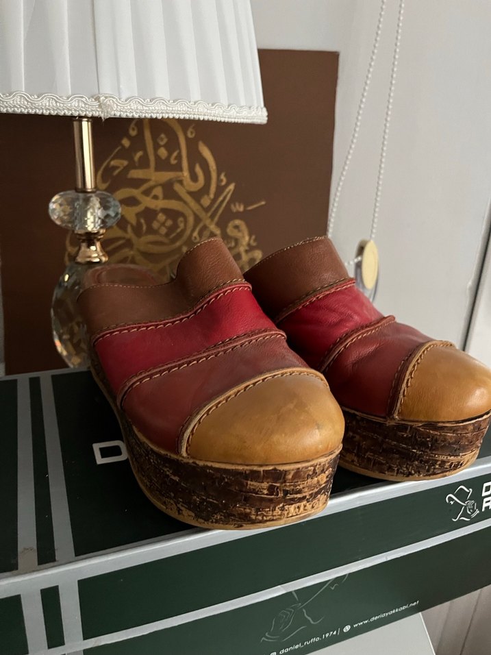 Kahverengi deri dolgu topuk espadriller, bohem tarzda, tokalı tasarıma sahip. Günlük kullanım için vintage dokunuşlu. Desa marka dolgu topuk terlik
