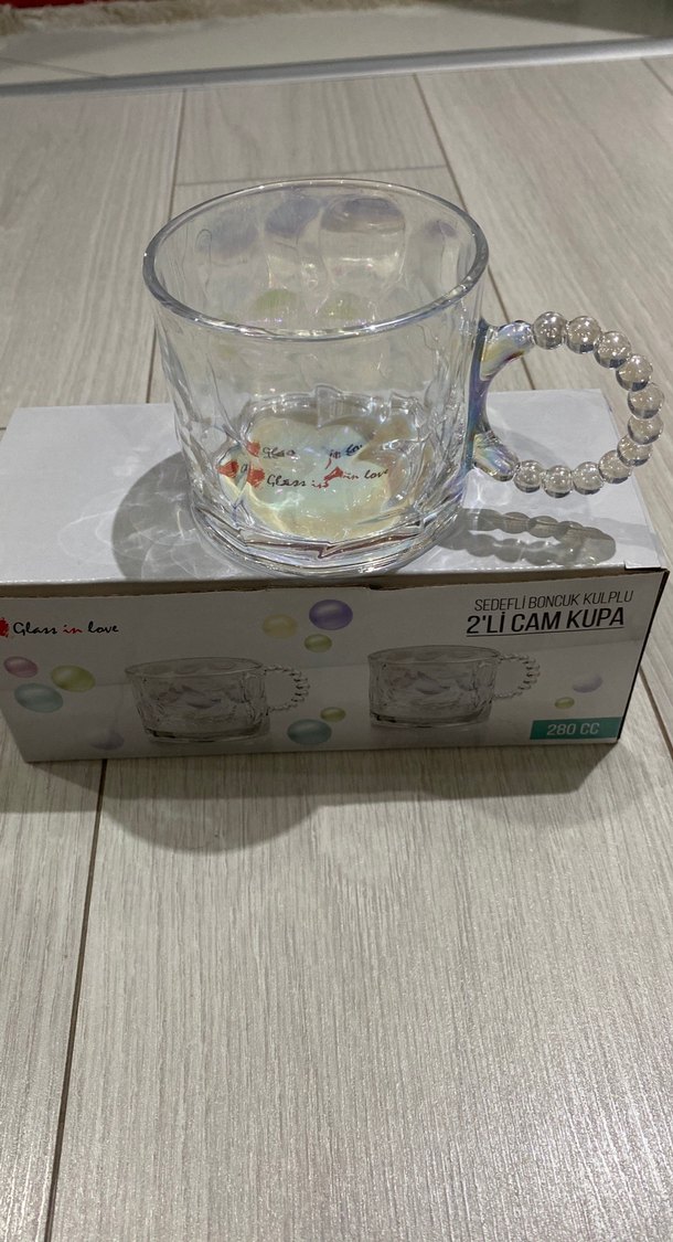 İnce detaylı, sedefli boncuk kulplu 2'li cam kupa seti, her biri 280 cc hacmindedir. ☕