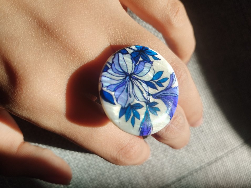 Sedefli Mavi Çiçek Desenli Bohem Kadın Yüzük