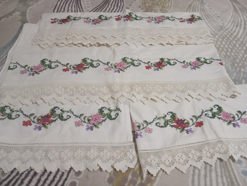 Nakışlı çiçek desenleri ve dantelli kenarları olan beyaz masa Sedir Takımı , klasik tarzda pastel renklerde.