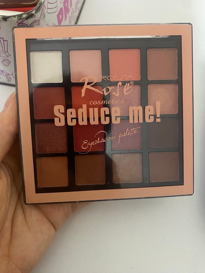 Roza Cosmetics'in Seduce Me! göz farı paleti, mat ve ışıltılı koyu bej ve kahverengi tonlarından oluşur, çeşitli göz makyajları için uygundur.