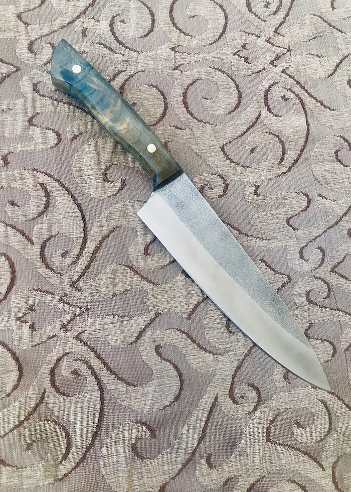 Avrupa stil şef bıçağı Çelik N690 böhler Paslanmaz çelikler içinde sınıfının en iyisidir İyi paslanma direnci yeterli bir tokluk ve keskinliğini koruma kabiliyetine sahiptir. TOPLAM BOY 313 MM NAMLU BOYU 188 MM KALINLIK 2.7 MM PİM DELİKLERİ 6MM SERTLİK 59 -60 HRC Kabze stabilize ağaç mavi liner pirinç pimler Suya dayanımını arttırmak için 5 kat Japon kaplama yapılmıştır
