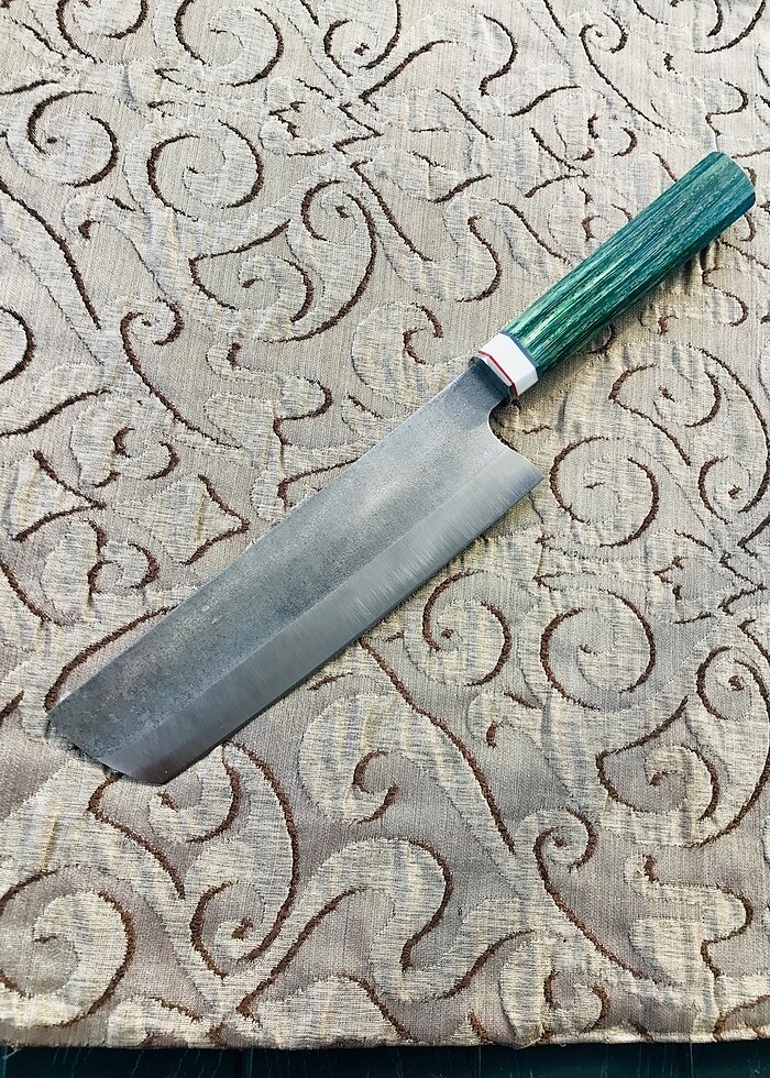 Nakiri model N690 Çelik 3 mm kalınlık Toplam boy 35,5 cm Kesici ağız 20 cm Kabze stabilize ağaç Ara parçalar corion liner Çelik balçak el işçiliği ürün