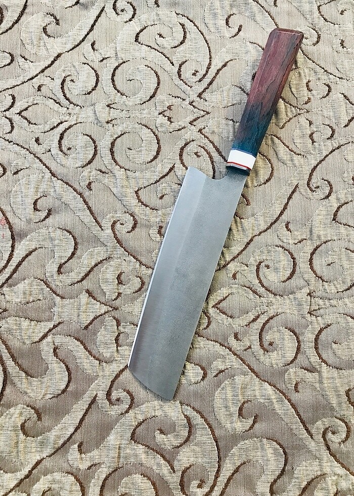 Nakiri model N690 Çelik 3 mm kalınlık Toplam boy 35 cm Kesici ağız 20 cm Kabze stabilize ağaç Ara parçalar corion liner Çelik balçak el işçiliği ürün