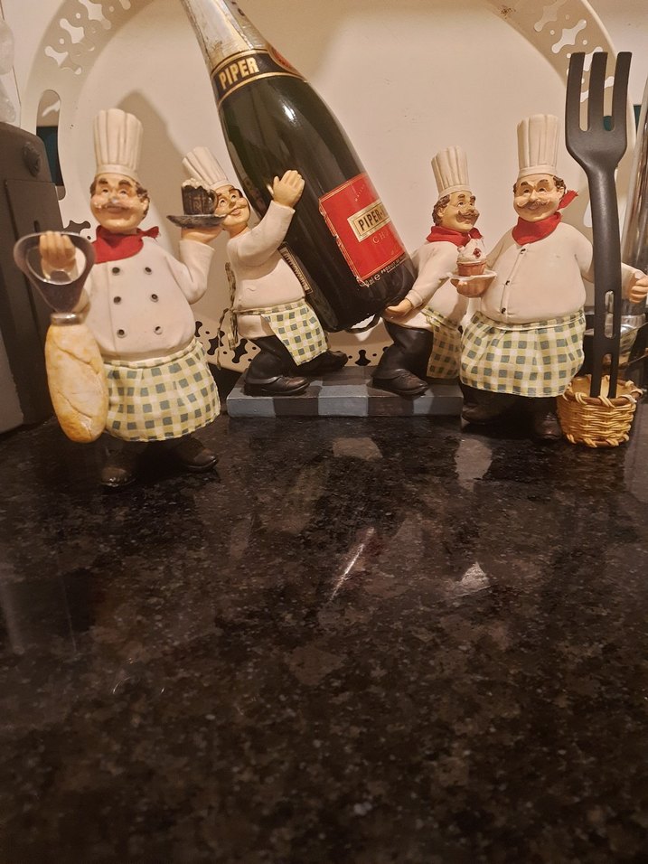 Beyaz kıyafetli şef figürlerinden oluşan set, mutfak gereçleri ve şarap şişesi tutucusu içerir. Koyu taban canlı detaylarla tamamlanır. 1 ahcinin boynu kırılmıştı yapıştırdım ufak tefek makyajinda belli olmayan sorunlar var kullanıldı şişe tutacağı hasarsizdir