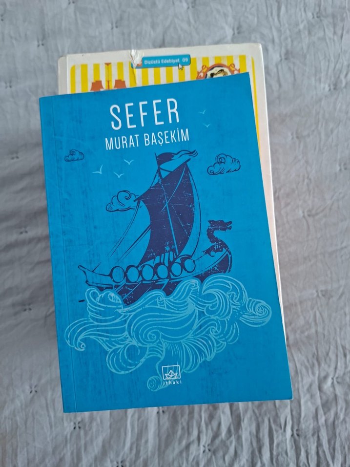 Murat Başekim'in Sefer adlı şiir kitabı, üzerinde gemi illüstrasyonu bulunan mavi kapaklı bir eserdir.