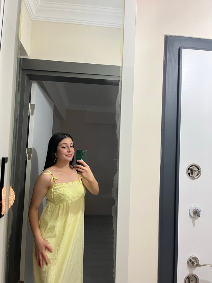Şeffaf detaylı, askılı ve bol kesim sarı midi elbise. İpek gibi kumaştan, minimalist tarzda, günlük kullanım için uygun.