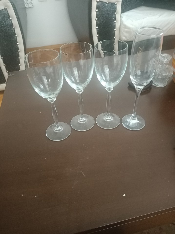 Farklı şekillerde dört adet şeffaf ayaklı bardak seti, çeşitli içecekler için uygundur. Hafif ve şık tasarım.