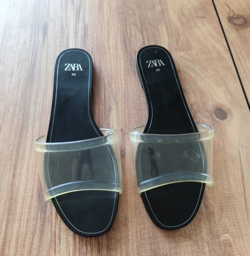 ZARA'nın 40 numara siyah blok topuklu, şeffaf bantlı kauçuk terlikleri, minimalist ve şık bir görünüm sunar.