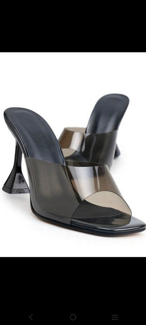 Şeffaf bantlı siyah stiletto topuklu kadın ayakkabı, çağdaş ve avangart tarzıyla ofis için uygundur.