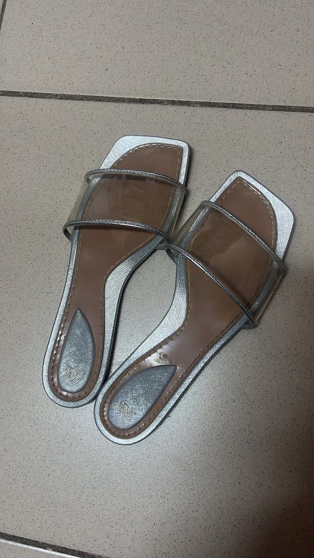 Şeffaf bantlı ve kahverengi yılan desenli tabanlı, topuklu kadın terlik. Minimalist ve çağdaş tarzda, toka detayı bulunur.