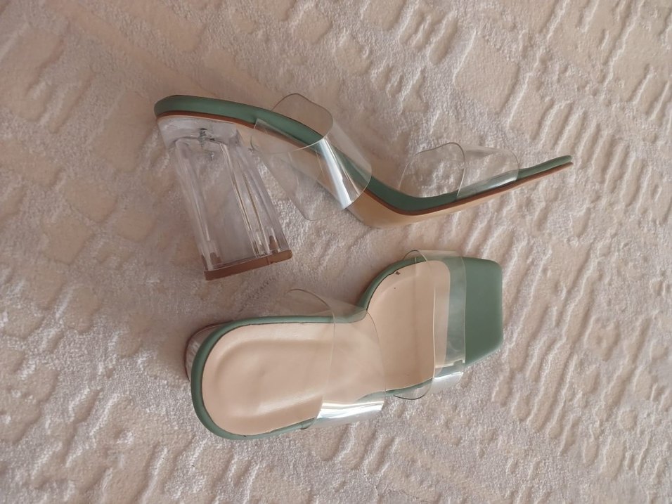 Şeffaf bantlı, blok topuklu, hafif yeşil renkli kadın terlik, çağdaş ve minimalist tarzda, kauçuk malzemeden üretilmiştir.