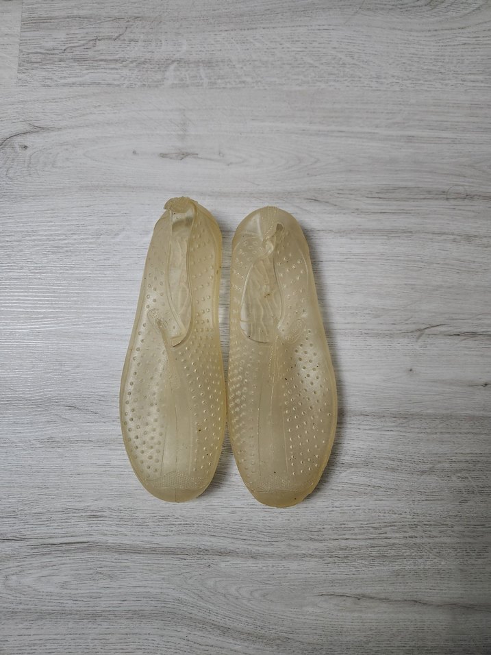 Şeffaf bej renkte, kauçuk malzemeden üretilmiş erkek su ayakkabısı. Minimalist ve sade tasarıma sahiptir, plaj için uygundur. kızım 3 gun giydi