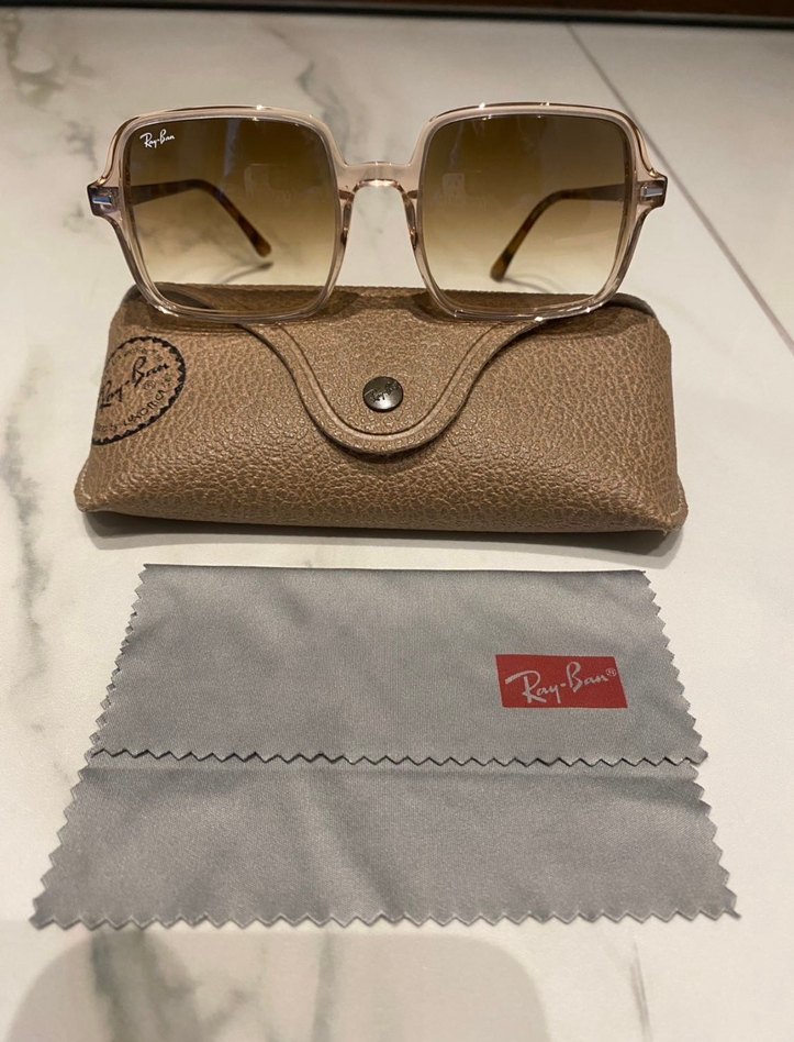 Şeffaf bej çerçeveli, açık kahverengi degrade camlı kadın güneş gözlüğü. Kahverengi deri kılıf ve temizleme bezi ile birlikte gelir. ️