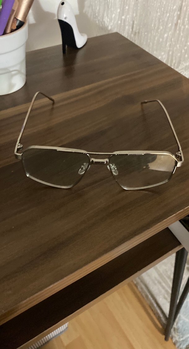 Şeffaf gri tonlu camlara sahip bej minimalist metal çerçeveli kadın gözlüğü, street wear stiline uygun.
