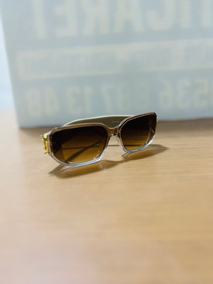 Şeffaf bej renkte, parlak yüzeyli, modern klasik tasarıma sahip minimalist kadın güneş gözlüğü. ️