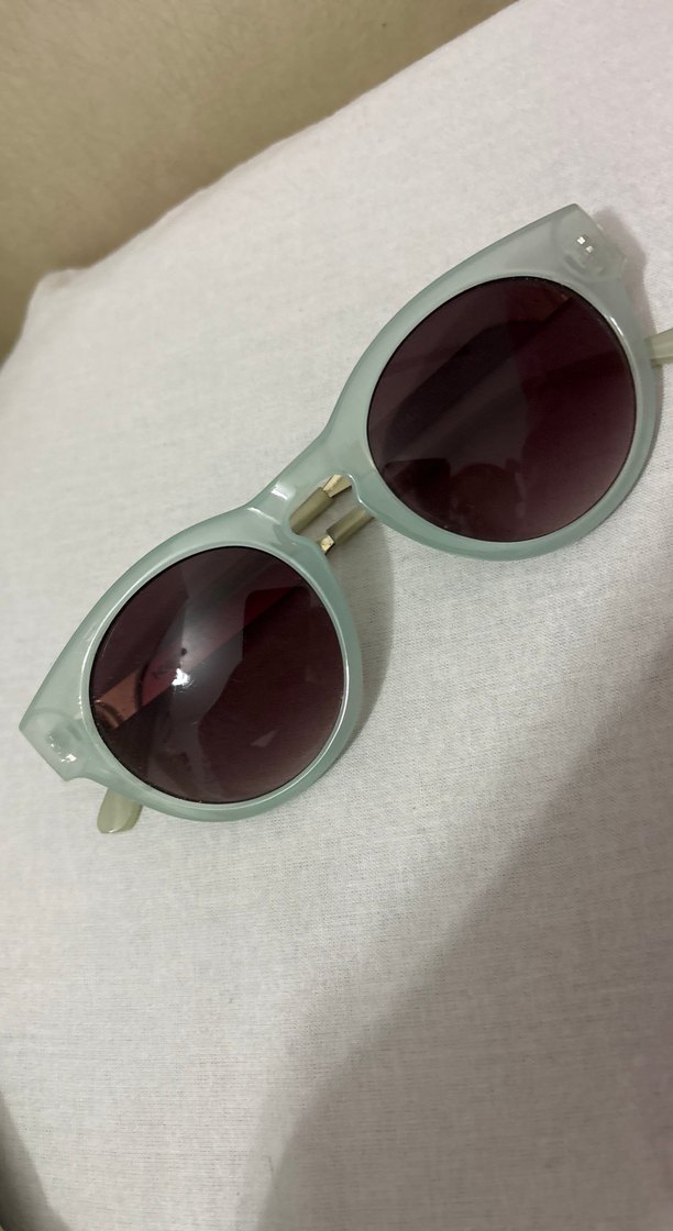 Pastel tonlarda, şeffaf bej renkte, yuvarlak camlı minimal ve retro tarzda kadın güneş gözlüğü. Az kıllanılmıştır