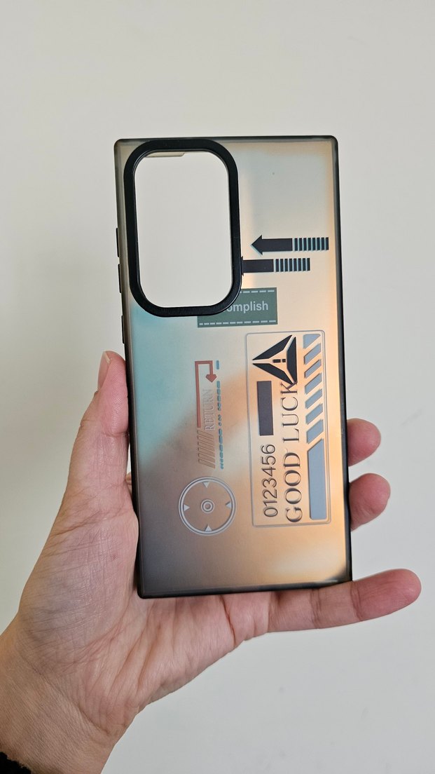 Şeffaf bej telefon kılıfı, çağdaş koyu renk detaylar ve 'GOOD LUCK' yazılı baskılar içerir. Yeni etiketli #telefon#telefonkılıfı#s23ultra#s23ultrakılıfı#samsung#samsunggalaxy#samsungkılıf#telefonkabı