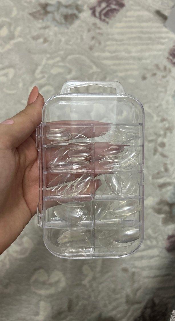 Farklı boyutlarda şeffaf bej tırnak süslemeleri, şeffaf plastik kutuda saklanıyor. 100 adet