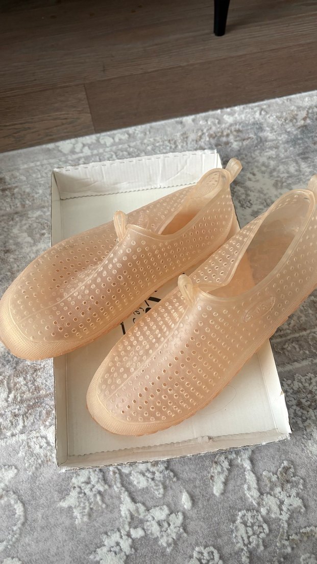Şeffaf bej renkte, lastik malzemeden üretilmiş kadın su ayakkabıları. 39-40 numara