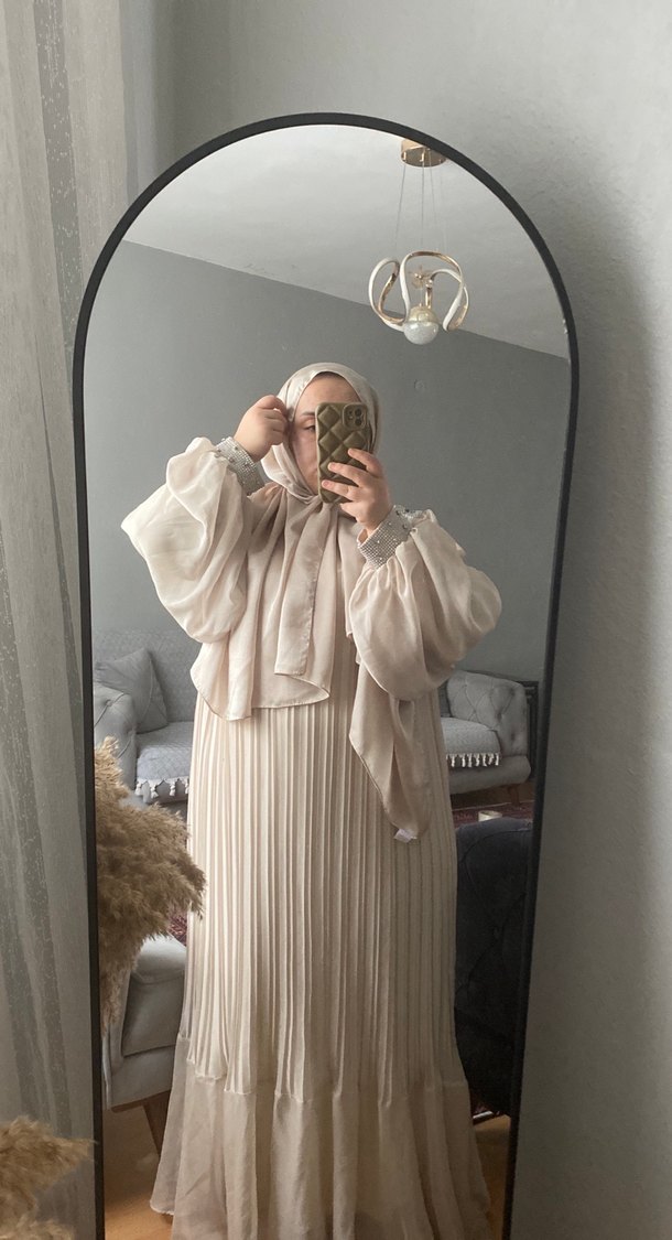 Bej renkte, şeffaf ve dökümlü uzun elbise. Yüksek yakalı ve uzun kollu, ipeksi kumaştan, günlük kullanıma uygun bohem tarzda.yanında şalı hediye 50 bedene kadar olur