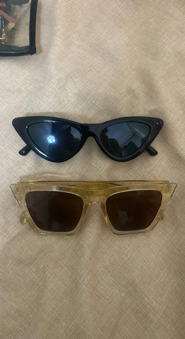 Koyu renkli camlara sahip, şeffaf bej ve siyah renklerde, kedi gözü ve dikdörtgen çerçeveli retro kadın güneş gözlüğü. ikili olarak satılmakta.