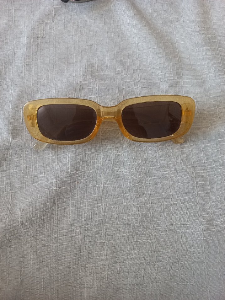 Şeffaf bej çerçeveli, vintage ve retro tarzda kadın güneş gözlüğü. Dikdörtgen camları bohem ve hippie havası taşır. ️