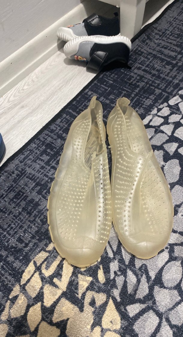 Günlük kullanıma uygun, minimalist tasarımlı, kauçuk malzemeden şeffaf beyaz erkek su ayakkabısı. Gri tonlarında, sade ve klasik stil.