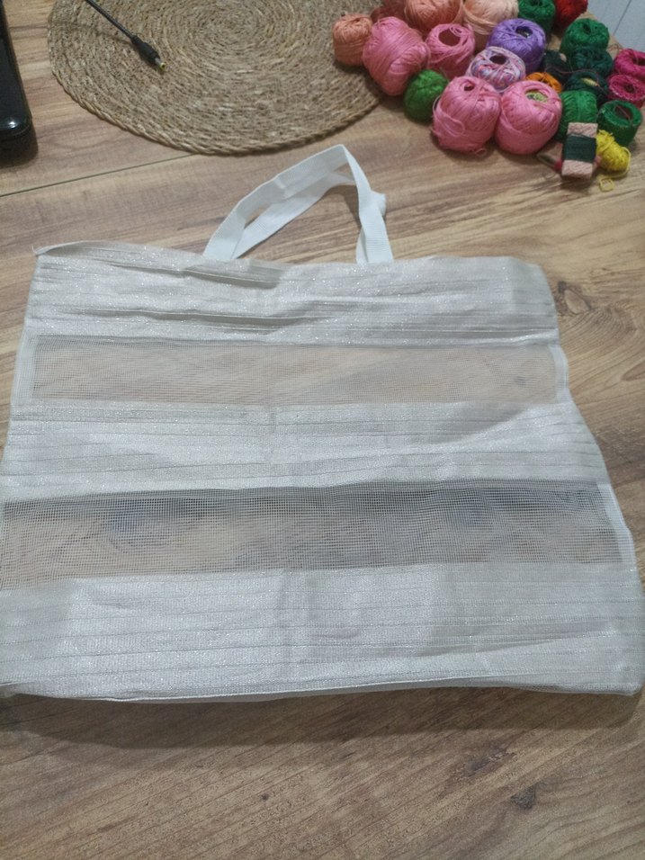 Beyaz sentetik kumaştan, şeffaf bölümleriyle minimalist ve bohem tarzda kadın plaj çantası. Desensiz, günlük kullanıma uygun.