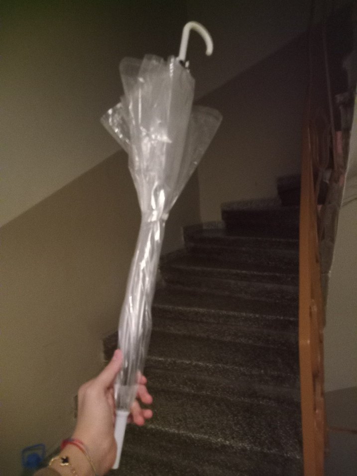 Şeffaf kanopisi ve beyaz sapı olan kadın şemsiye, minimalist ve avant-garde tarzlarıyla şık bir görünüme sahiptir.
