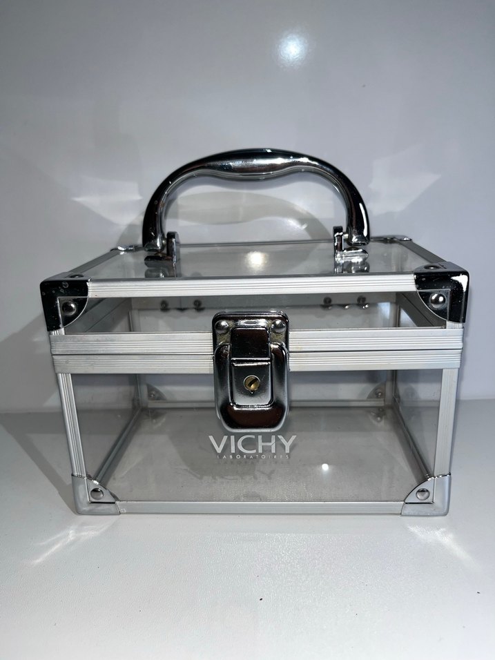 Parlak beyaz renkte, şeffaf tasarımlı makyaj düzenleyici kutusu. Taşıma için sağlam sap ve güvenli mandallara sahiptir.