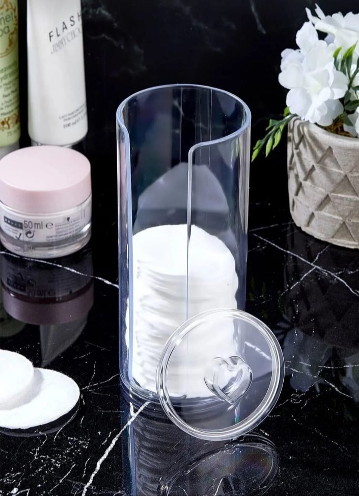 Şeffaf beyaz renkte, kapaklı silindirik tasarıma sahip makyaj pamukluğu. Pamukları düzenli saklamak için idealdir.
