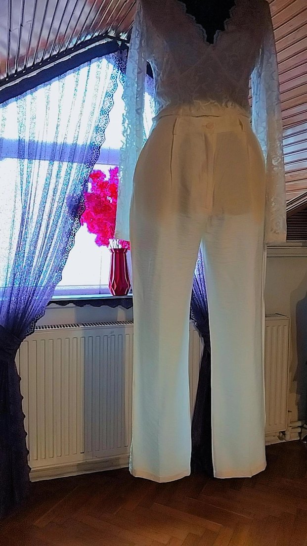 İpek gibi dokulu, şeffaf detaylı beyaz kadın pantolon. Normal kesim ve midi boy, modern ve şık bir görünüm sunar.