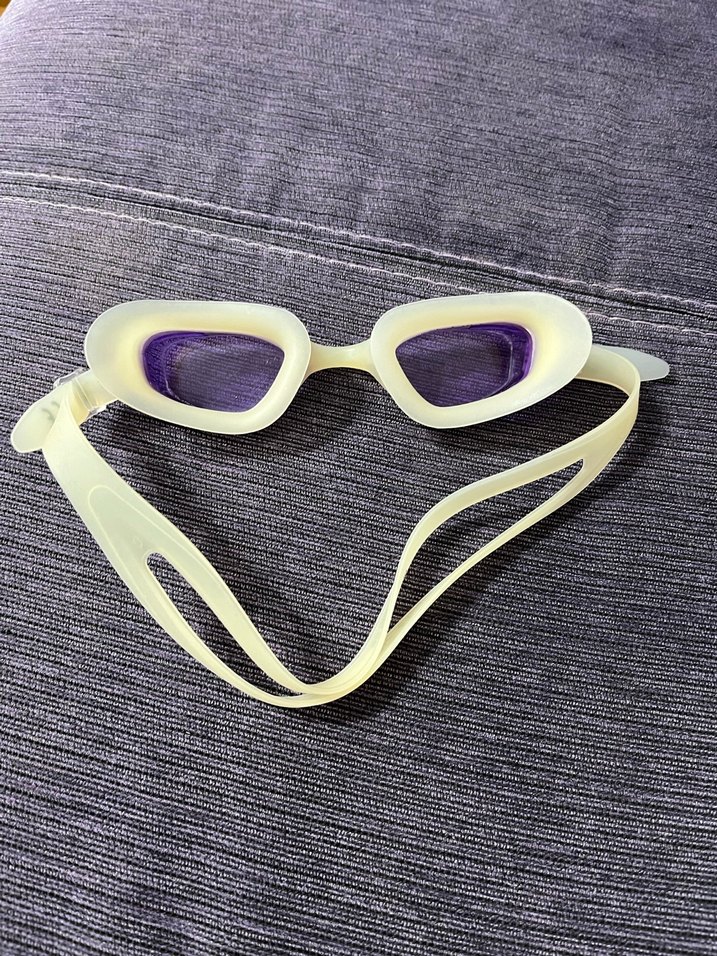 Şeffaf beyaz çerçeveli, hafif mor renkli lenslere sahip, minimal ve bağlama desenli yüzücü gözlüğü. Modaya uygun, avant-garde plaj stilleri için ideal. ️