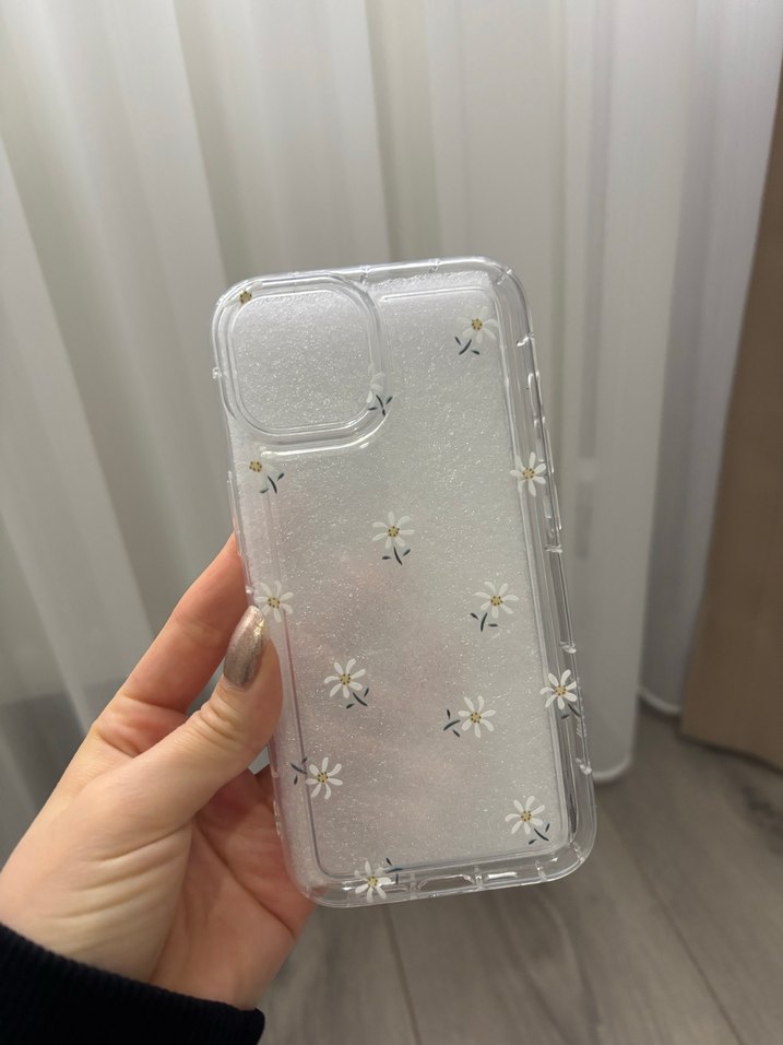 Şeffaf ve beyaz renkli, bohem tarzda papatya desenli telefon kılıfı, zarif bir görünüm sunar.