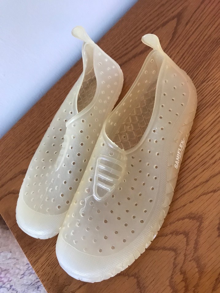 Kullanılmış. şeffaf beyaz kauçuk su ayakkabısı, hafif ve nefes alabilir yapısıyla günlük kullanım için uygundur.