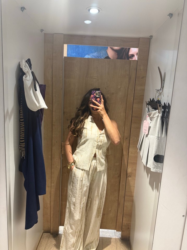 Beyaz, uzun, kolsuz ve bol kesim elbise. İnce, şeffaf, ipeksi kumaş ve straplez yakaya sahip. Hafif batik desenli, düğünler için uygun bohem tarz.