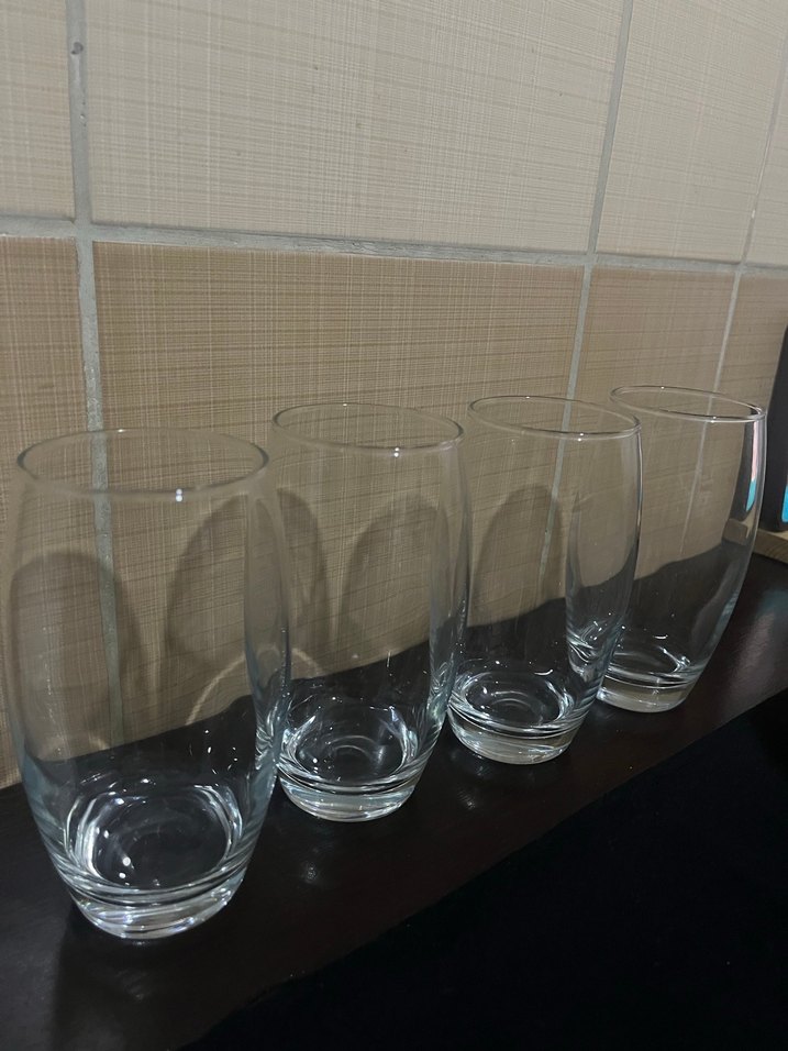 Dört adet şeffaf camdan oluşan, sade ve zarif tasarımlı su bardakları seti.
