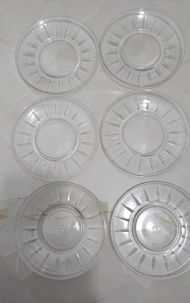 Altı adet şeffaf cam tabaktan oluşan set. Her tabakta kenarda hafif bir radyal desen bulunur. ️