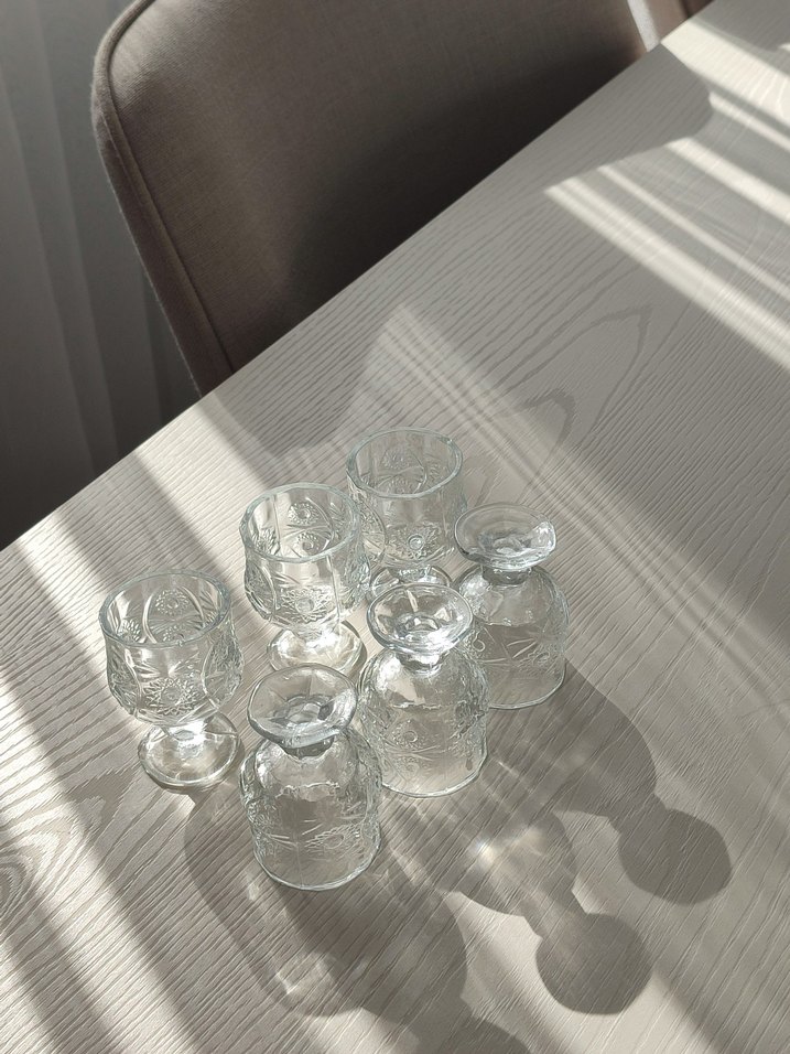 Altı adet küçük, şeffaf ve dokulu cam bardak seti. Işığı güzel yansıtan şeffaf camdan yapılmıştır.