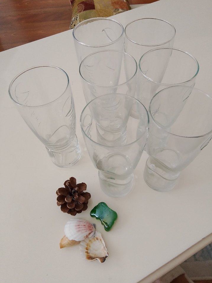 Yedi adet şeffaf cam bardak ve dekoratif deniz kabukları ile kozalak içerir. İçecek servisi için uygundur. 7 âdet