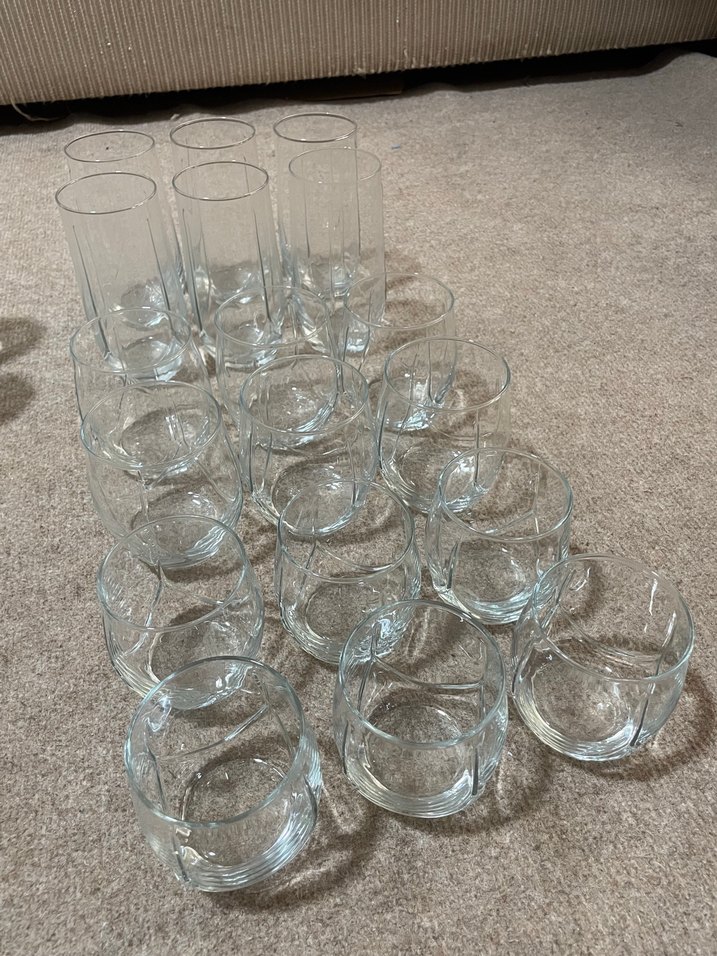 Farklı boylarda, çeşitli içecekler için uygun şeffaf cam bardak seti.