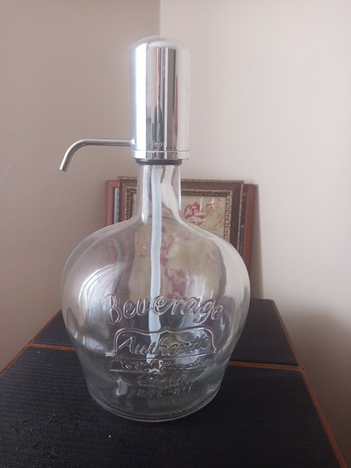 Metal pompalı, şeffaf camdan yapılmış bebek biberonu. Üzerinde kabartma yazılar bulunur, pompa metalik gümüş rengindedir.