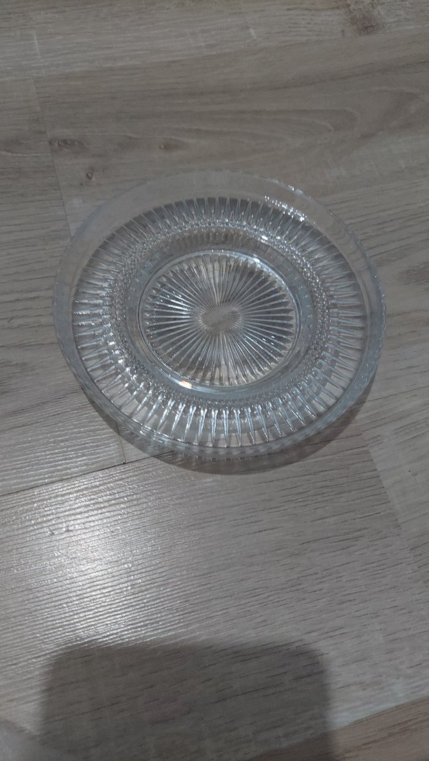 Şeffaf camdan yapılmış, yüzeyinde hafif dokulu sade bir tasarıma sahip tabak. Düz tabanlı ve yuvarlak kenarlıdır. ️